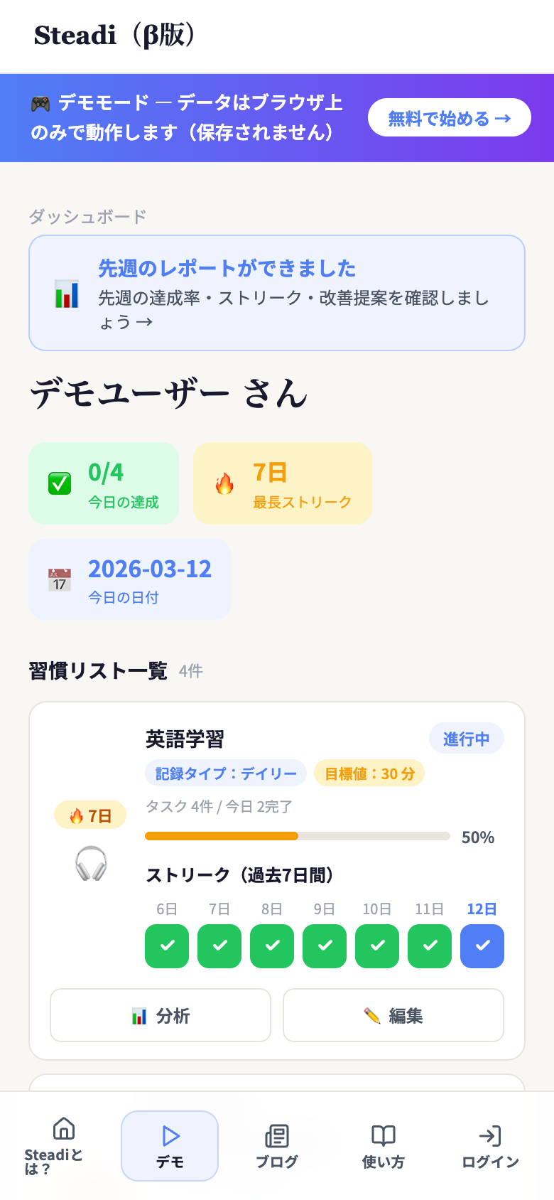 習慣リストの作成(最大5件)、タスクの追加・チェック、4種類の記録タイプ、直近7日の基本分析、ストリーク追跡がご利用いただけます。