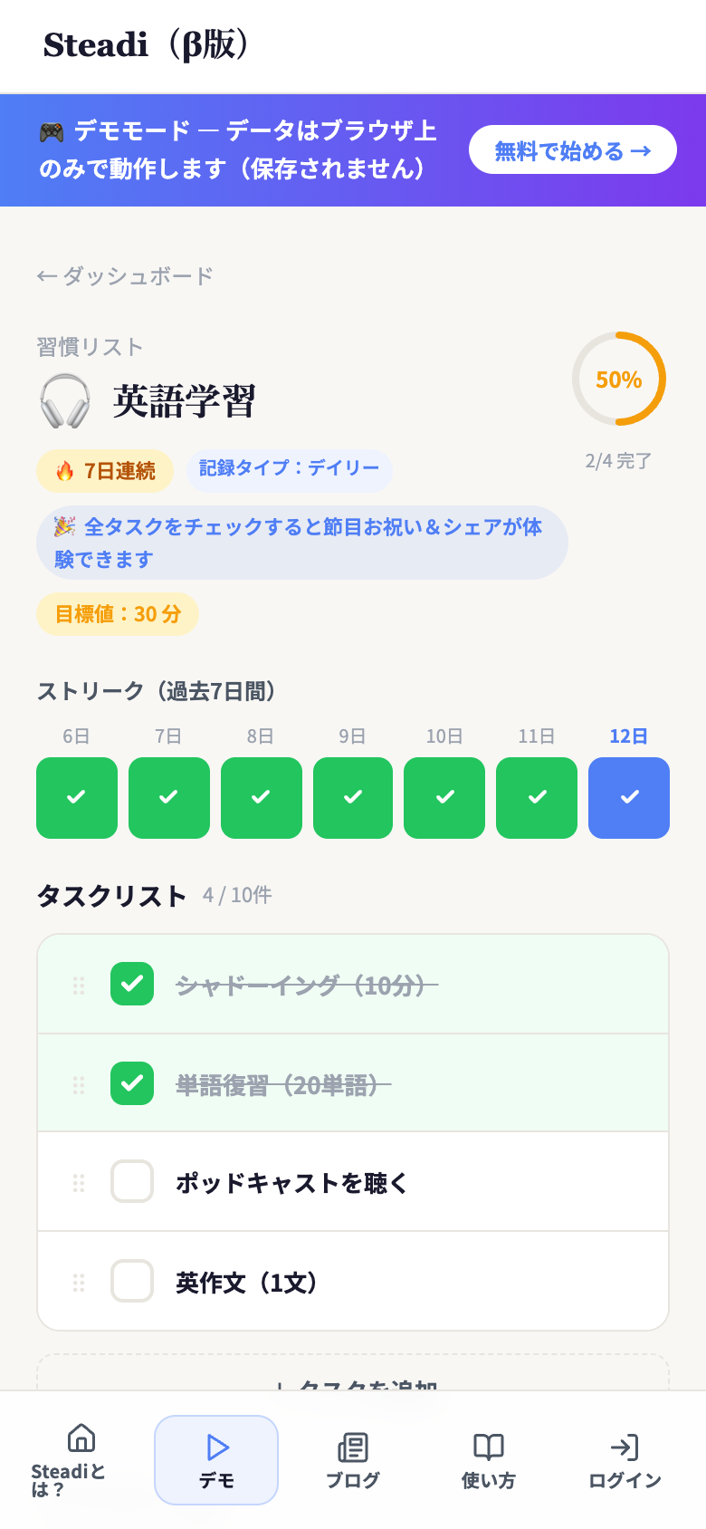 Steadiは、習慣を「タスクに分解」して「数値で記録」する。
